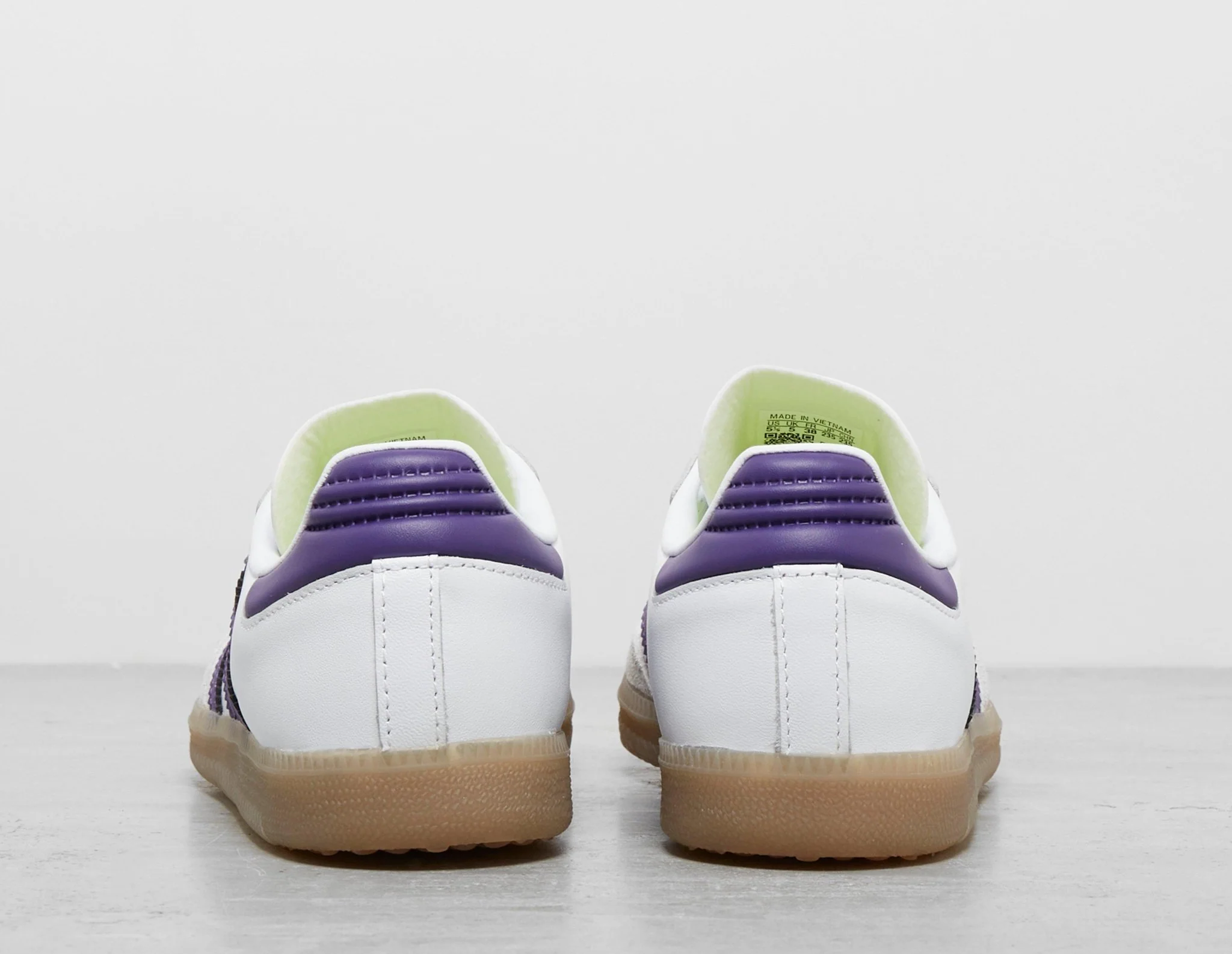 Since Messi joined Inter Miami in 2023, there's been an exciting line of adidas terrace silhouettes that have followed, now including a new Samba. Coated in white leather with buttery suede applied to the T-toe, the stand-out on the upper is the purple 3-Stripes and heel counter. On the tongue, Messi's adidas logo appears in neon green, matching the insoles, which are stamped with the performance logo. Anchoring the design is a signature gum rubber sole unit. | IH8161