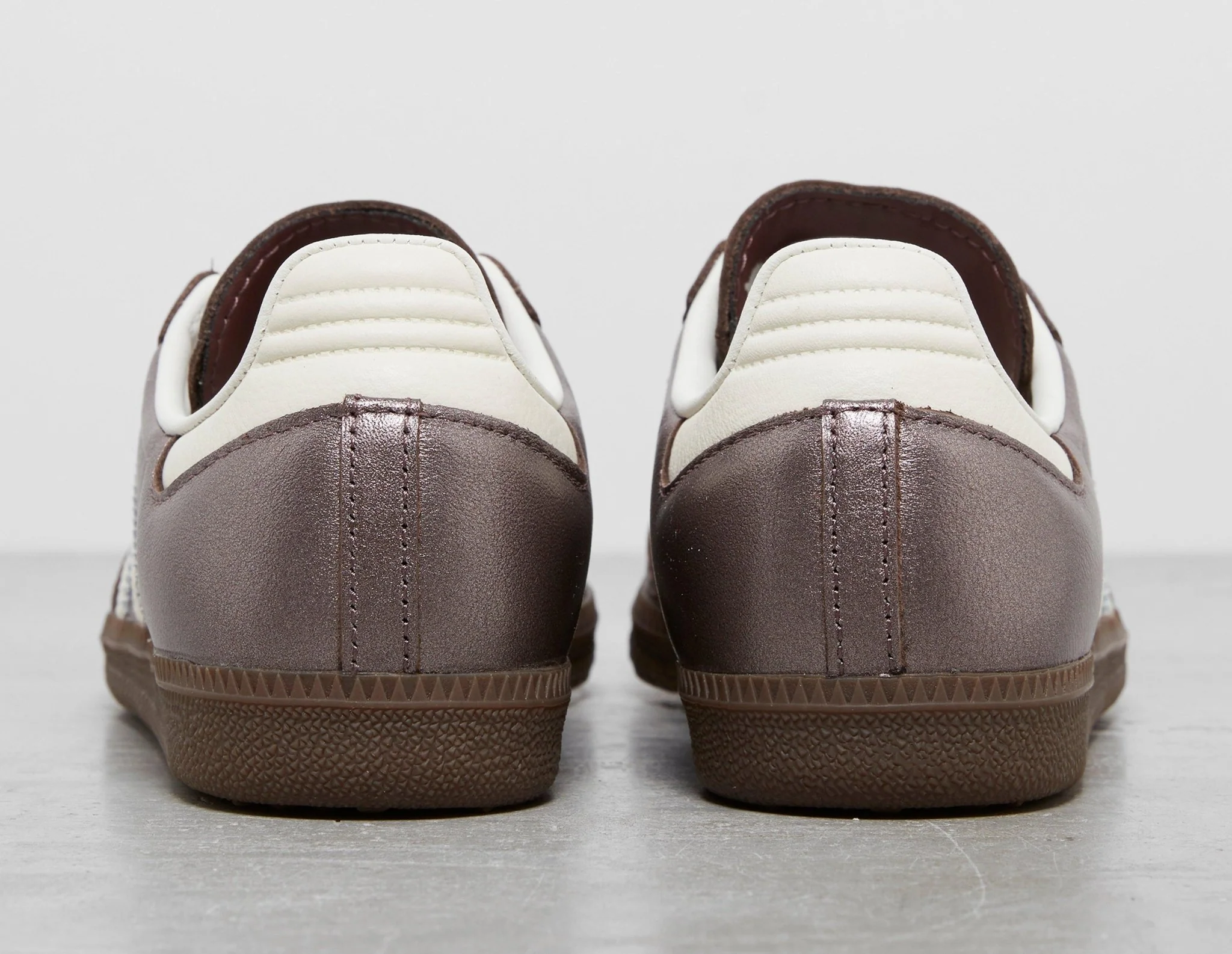 Dreamt up in the 1940s for the pitch, the adidas Originals Samba OG has transcended the world of sports to become a mainstay in streetwear. For a futuristic touch, premium metallic purple leather wraps the upper with touches of 'Off White' graces the serrated 3-Stripes and heel tab. Debossed Trefoil branding stamps the tongue, while a rubber sole unit anchors the design. | JI4219