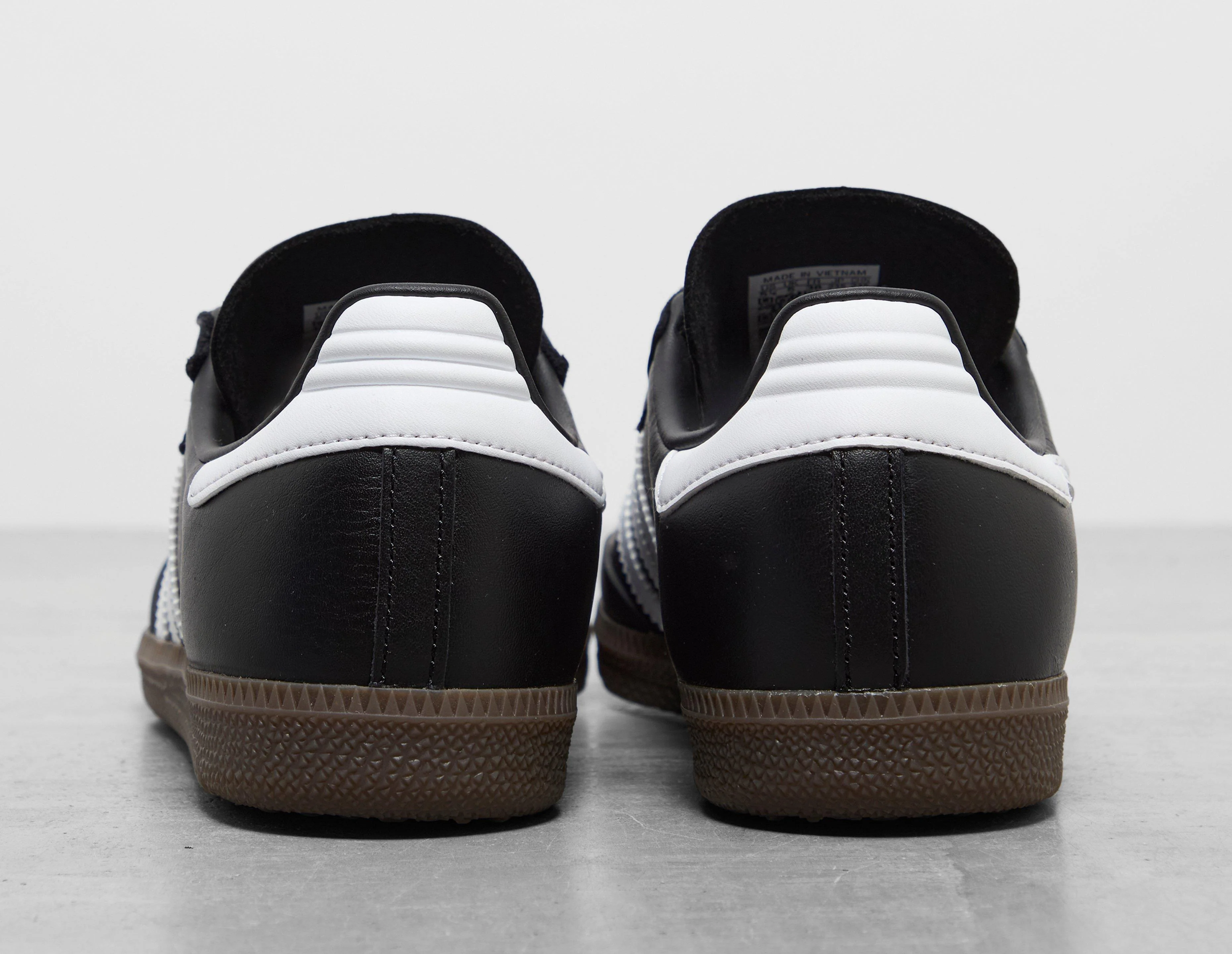 Driven by the raw creativity of freestyle football and the personality that fuels street culture, the adidas x BAPE Football collection fuses the Japanese label's underground roots with adidas' street-to-pitch identity. A classic setup with some notable differentiations from the original, black leather encases the collaborative Samba with white leather detailing for the right-sided STA logos and left-sided 3-Stripes. A moulded tongue nods to the football influence, and a rubberised T-toe provides a sturdier feel to the familiar construction, while a classic rubber sole unit completes the design. | JR9246