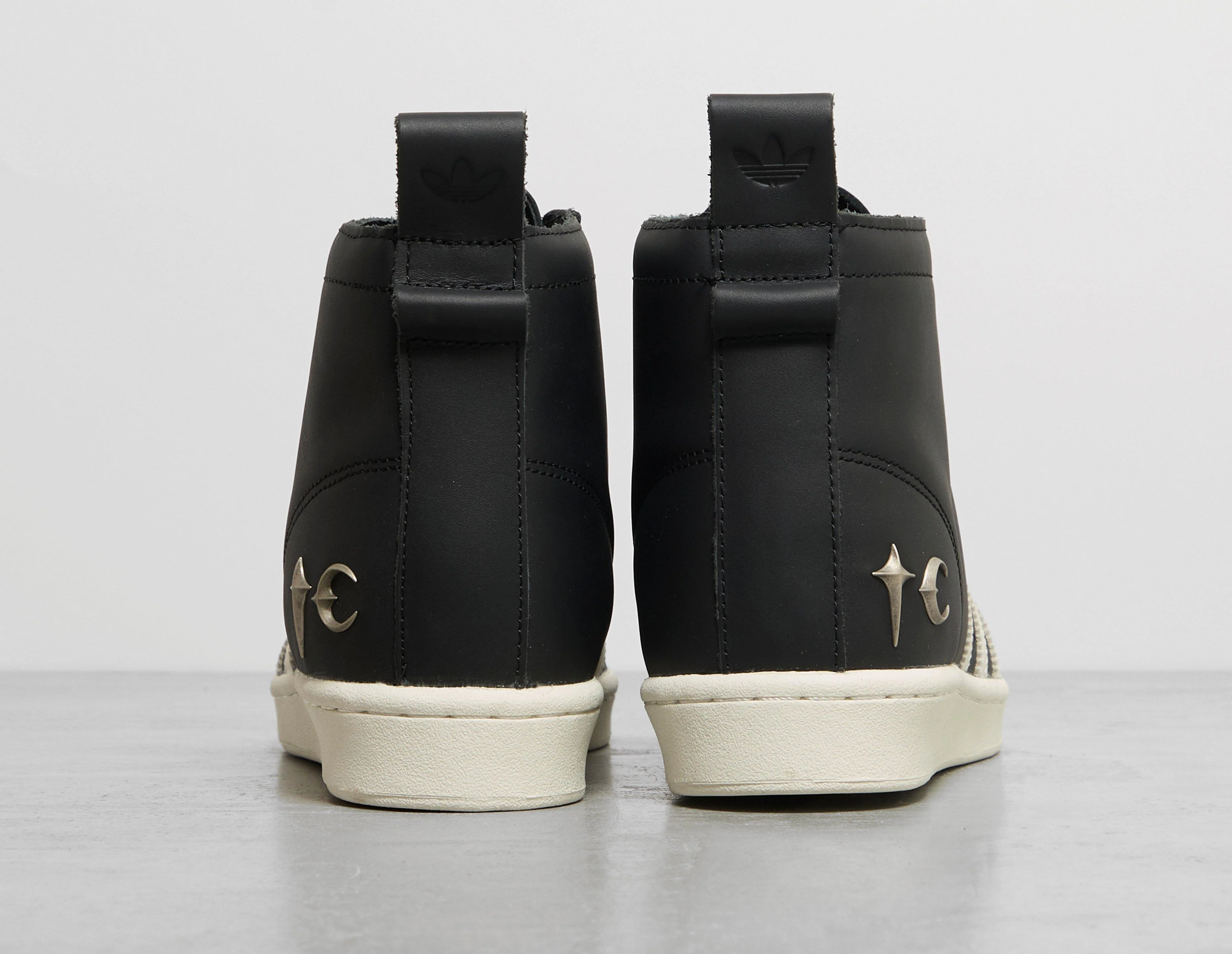 adidas reunites with South Korea's Thug Club, renowned for its unique blend of hip-hop and chopper bike culture. Reworking an original icon, this collaboration delivers something a little different with the Superstar Boot Luxe. Wrapped in premium black leather, this take on the Superstar features contrasting leather 3-Stripes, a Trefoil-stamped pull tab and a custom moulded shell toe. An 'Off White' rubber sole unit grounds the design, while a metal Thug Club emblem signs it off. | JP6519