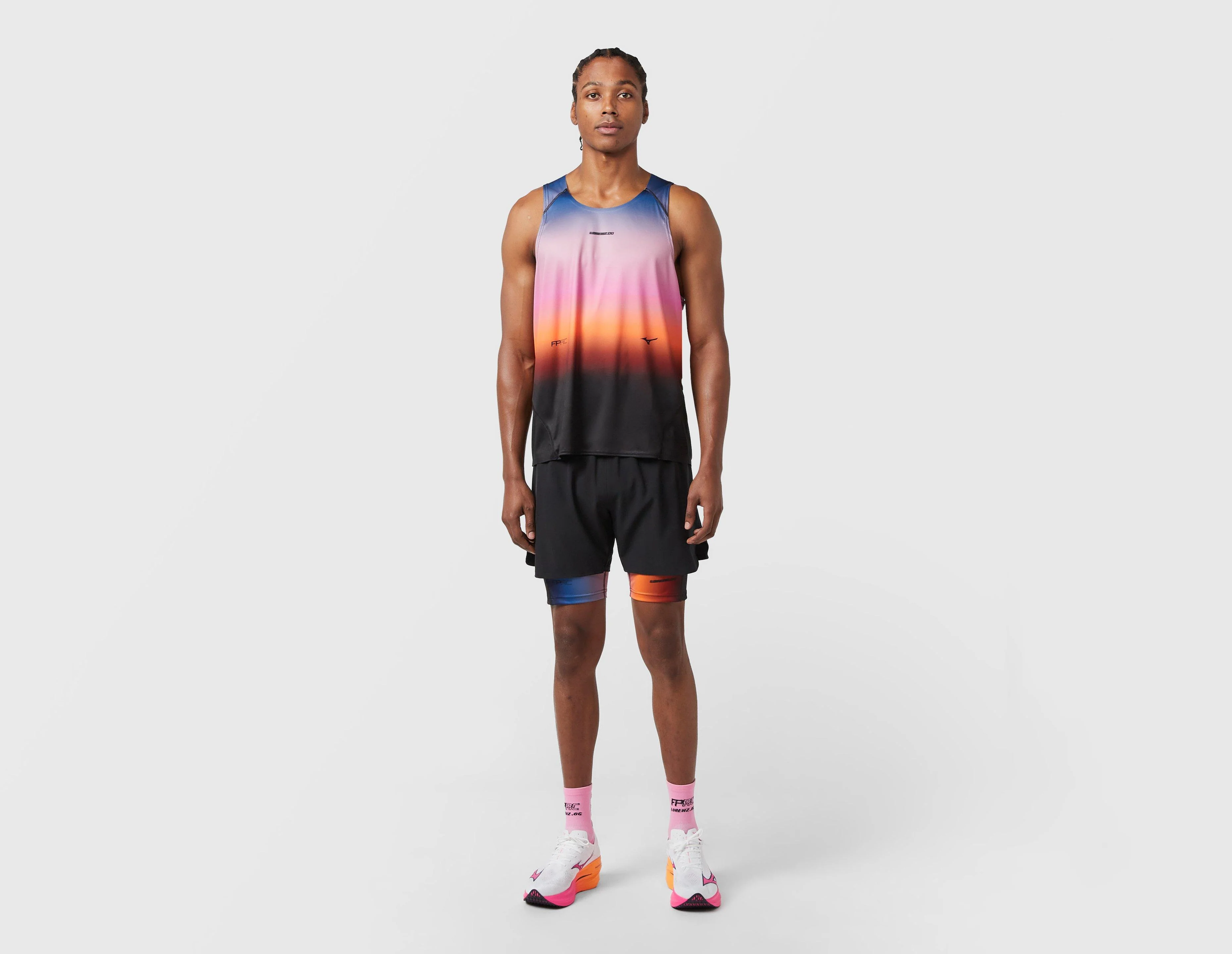 LORENZ.OG debuts his first-ever running collection with Mizuno and Footpatrol, introducing * FIRST LIGHT *. Constructed from lightweight recycled materials, the Tech Vest features a new gradient colour scheme seen throughout the collection, inspired by early sunrise and paying tribute to runners who meet the day's beginning. Co-branding across the design confirms the collaboration. | our model is 6'2" and wears a size medium